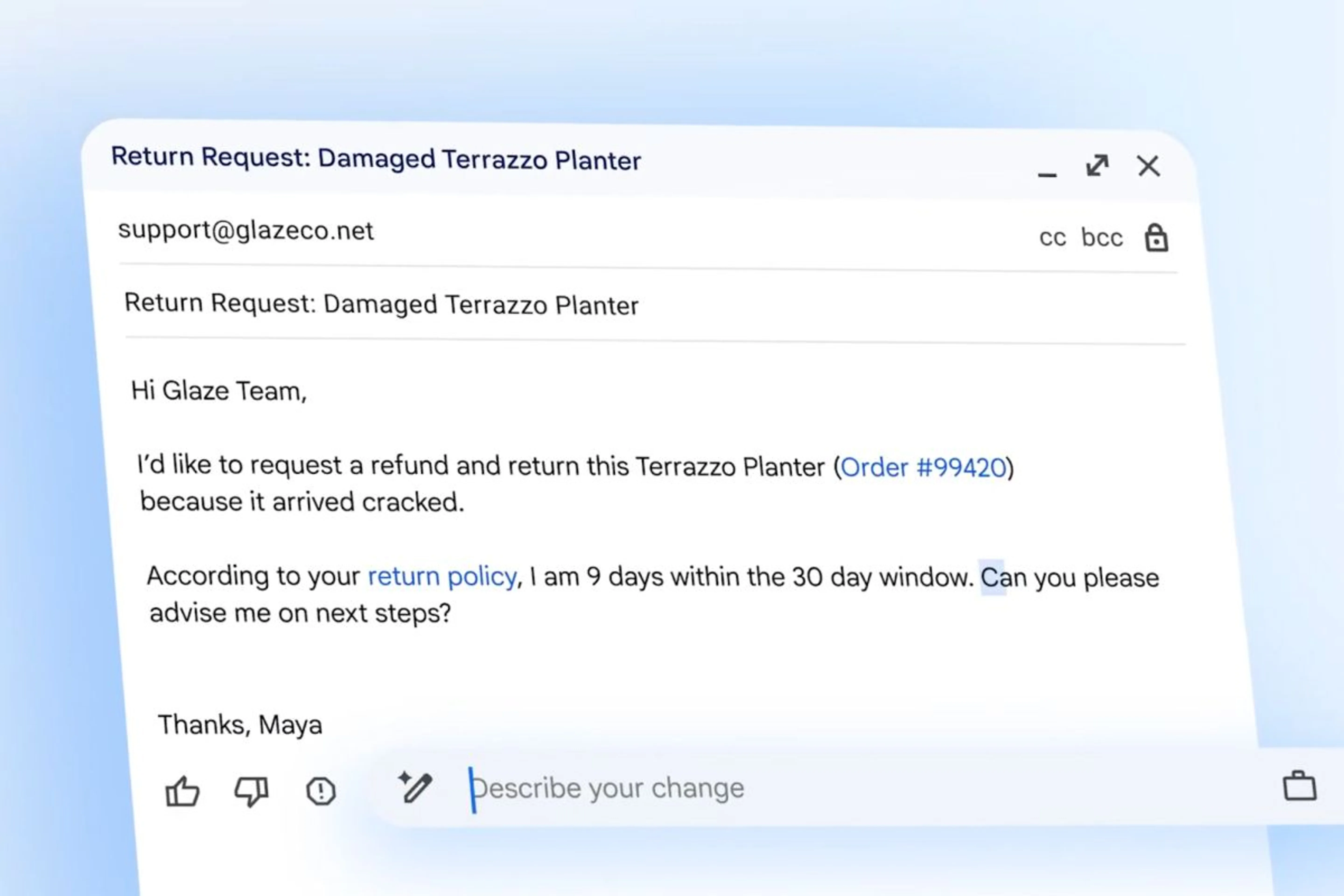 Платные функции пополнились возможностями более персонализированного поиска информации в Gmail. Например, Gemini можно попросить найти имя конкретного специалиста. Инструмент для проверки орфографии может выделить целое предложение, нуждающееся в улучшении, и предложить полное изменение. Функция позволяет сократить многословное предложение до нескольких лаконичных слов.