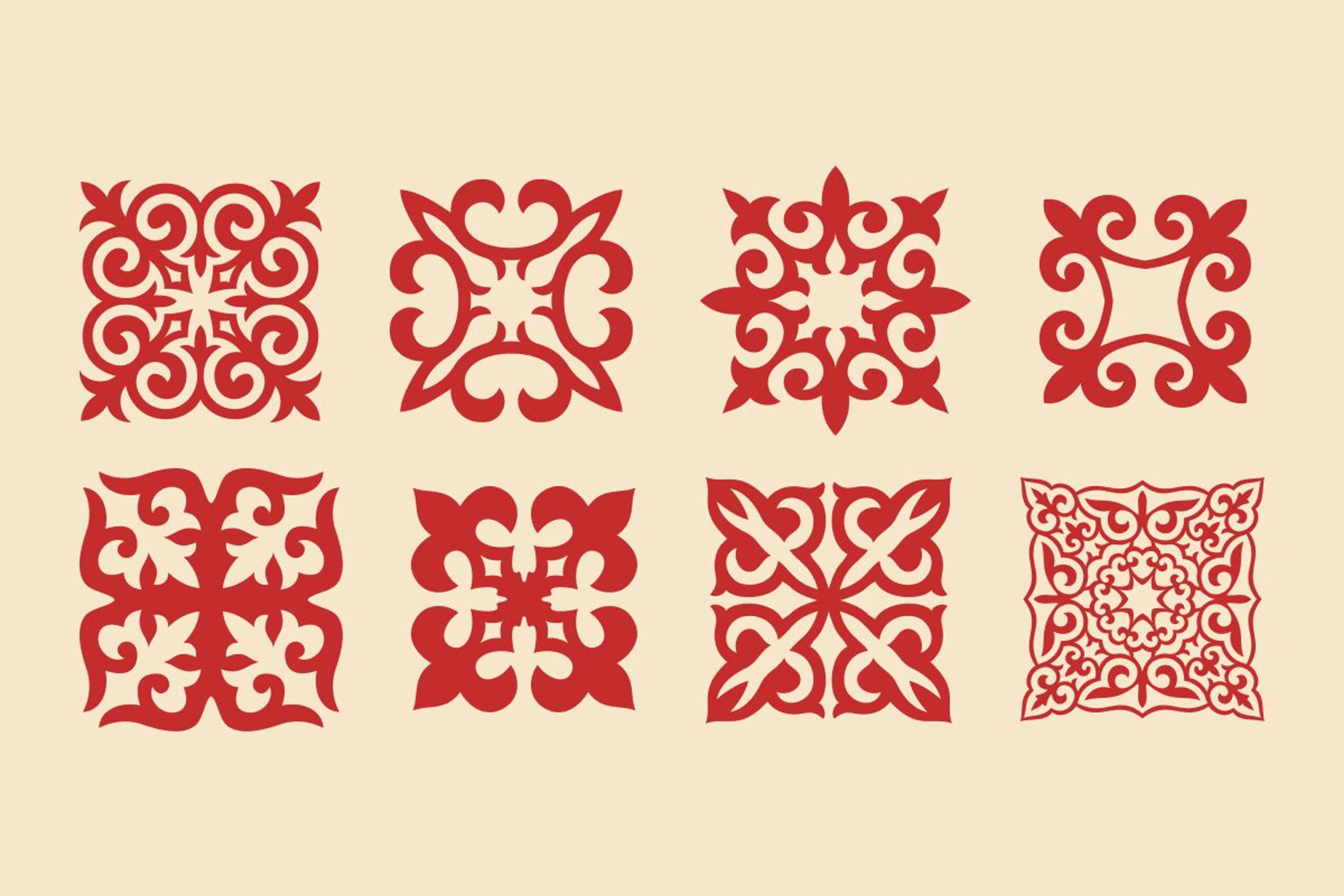 Постепенно сформировалось несколько основных типов казахских орнаментов. Одними из самых узнаваемых стали зооморфные узоры – стилизованные изображения животных, которые играли ключевую роль в жизни кочевников. В их числе мотивы, напоминающие бараньи рога, птичьи крылья, верблюжьи горбы или гусиную шею.