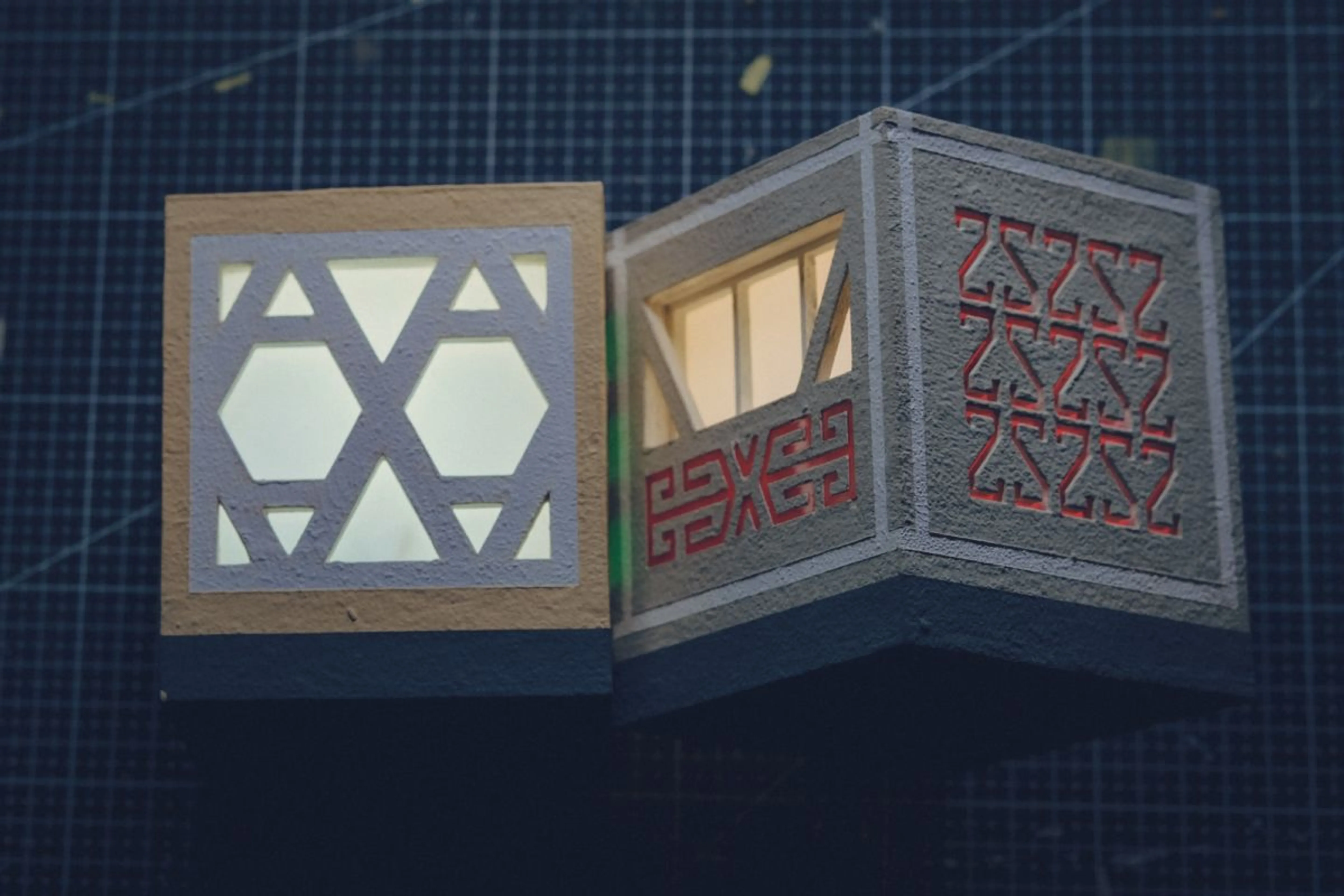 В университете Булат учился на дизайнера. Однажды дали задание – придумать светильник. Он сделал маленький высокий шестигранник, собранный из парных орнаментов – угловатых, квадратных, и похожих на пару лебедей, повернувшихся спиной.