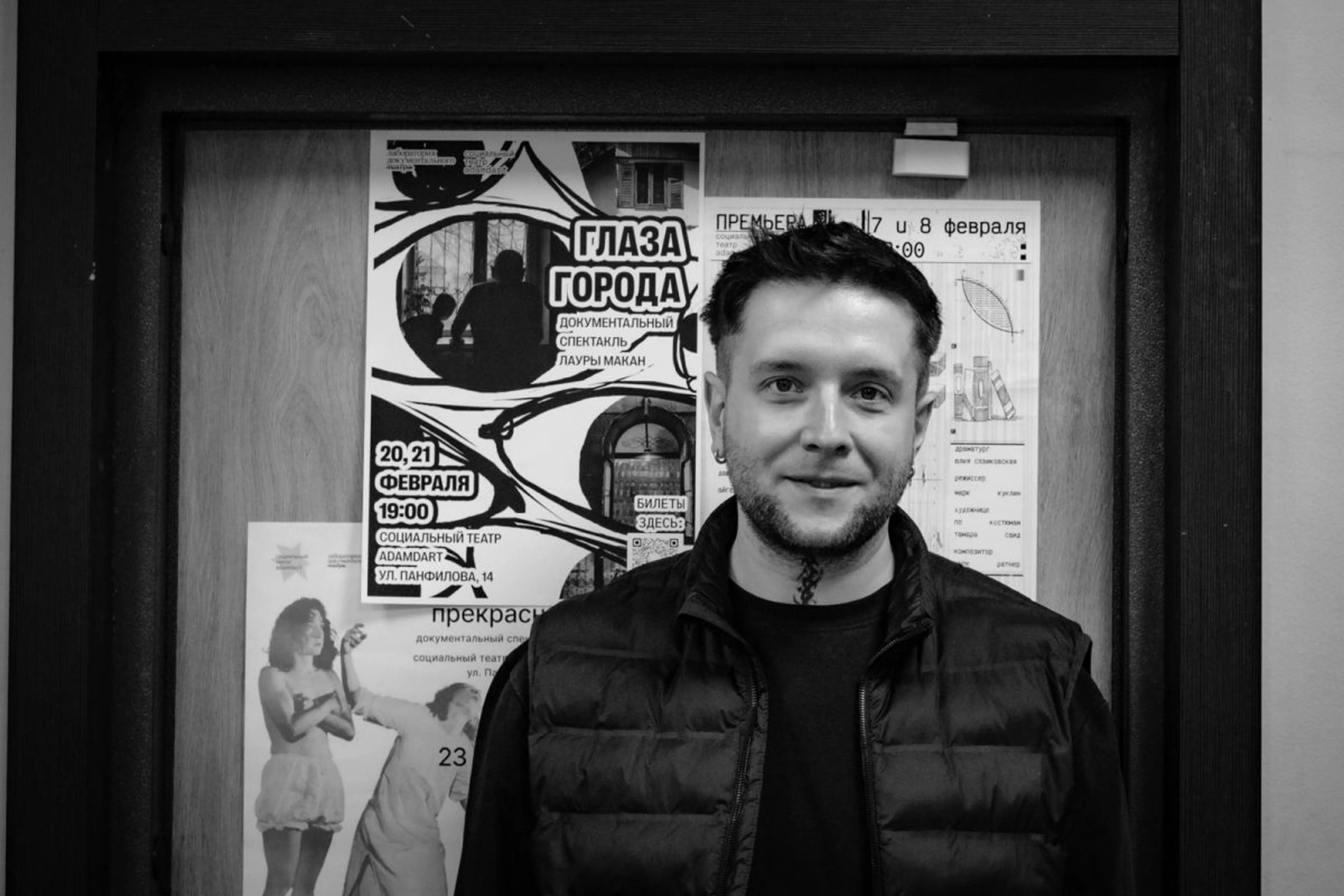 Тогда театры стали его картой города: площадки, пространства, чаты, встречи. Работать “в театр” он не идет: слишком много приехавших, слишком мало мест, слишком высока цена бытовой реальности. Уходит в фонды. Потом – почти случайная встреча и возможность стать независимым.