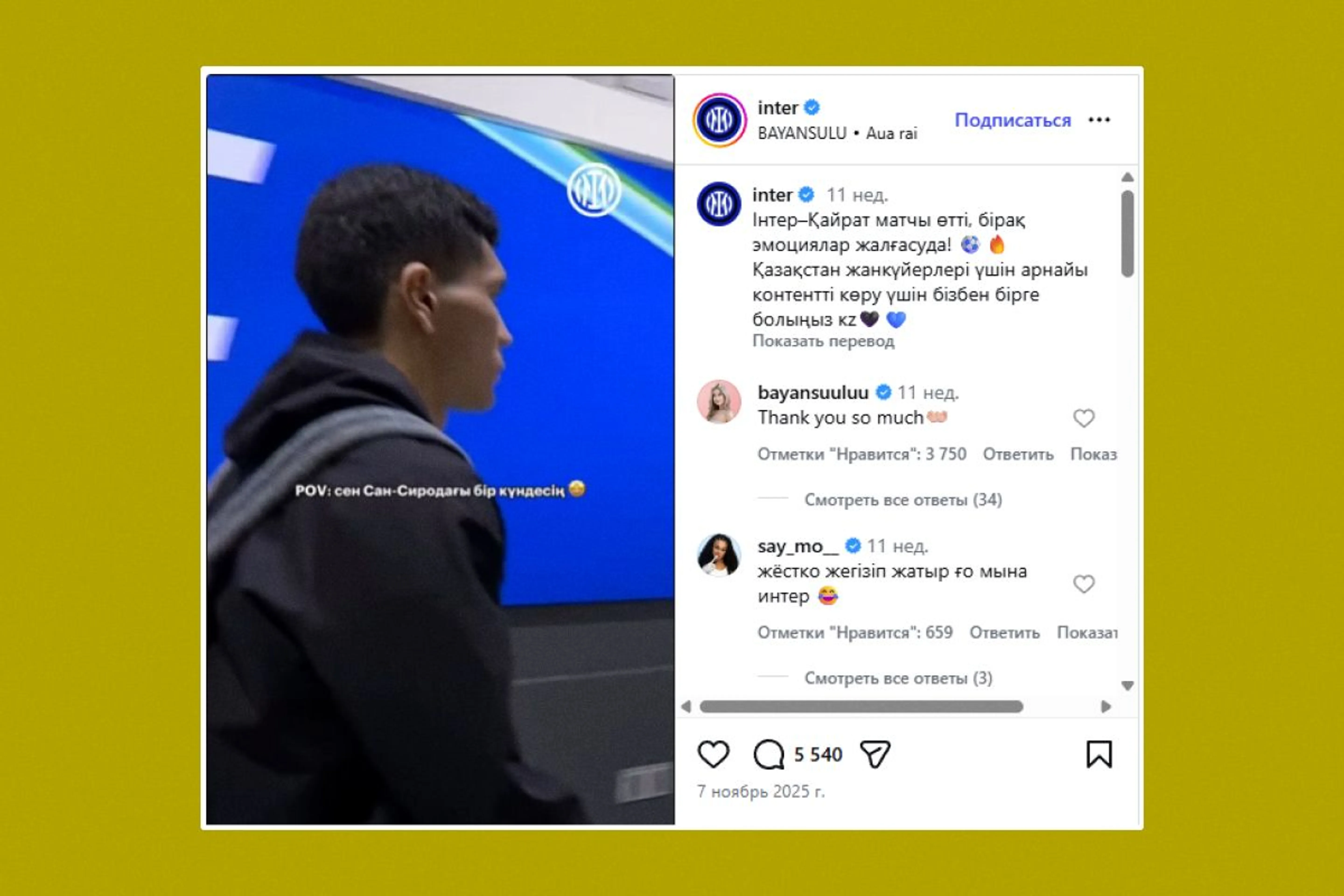 На матч с топ-клубом "Интер" в Милане "Кайрат" прибыл в роли аутсайдера. Но встреча завершилась со счетом 2:1 в пользу хозяев поля, а алматинцы сумели отыграться благодаря голу защитника Офри Арада. После игры официальный аккаунт "Интера" в Instagram долго заигрывал с активной аудиторией из Казахстана и публиковал посты с музыкой казахстанских исполнителей.