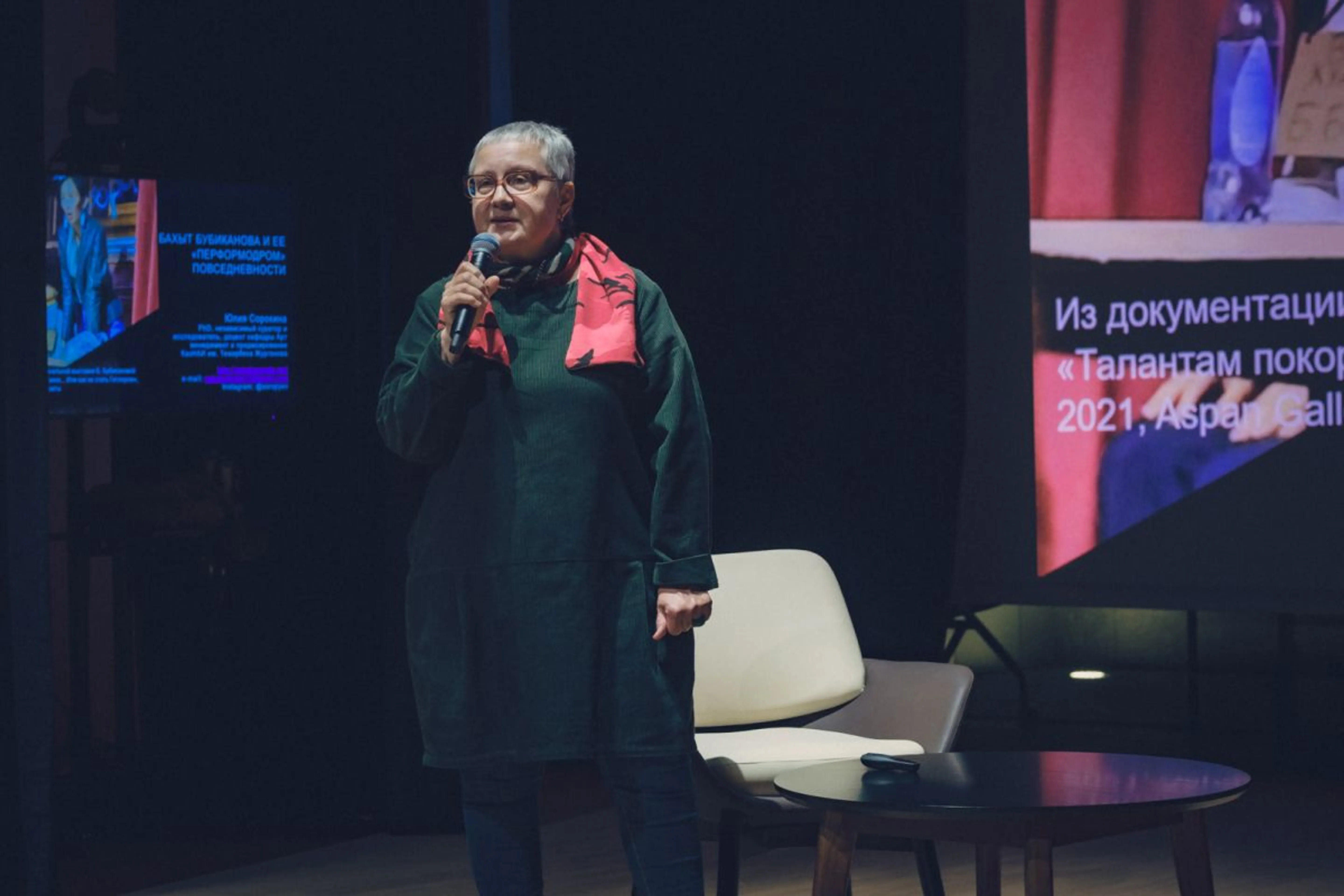 Вечер открытия инсталляции сопровождается лекцией искусствоведа Юлии Сорокиной “Бахыт Бубиканова и ее "перформодром" повседневности”. Юлия сразу снимает привычную академическую дистанцию, говорит честно, ей трудно. Ей важно выдержать эту речь “без слез”. Потому что это не только лекция исследовательницы, но и прощание подруги.