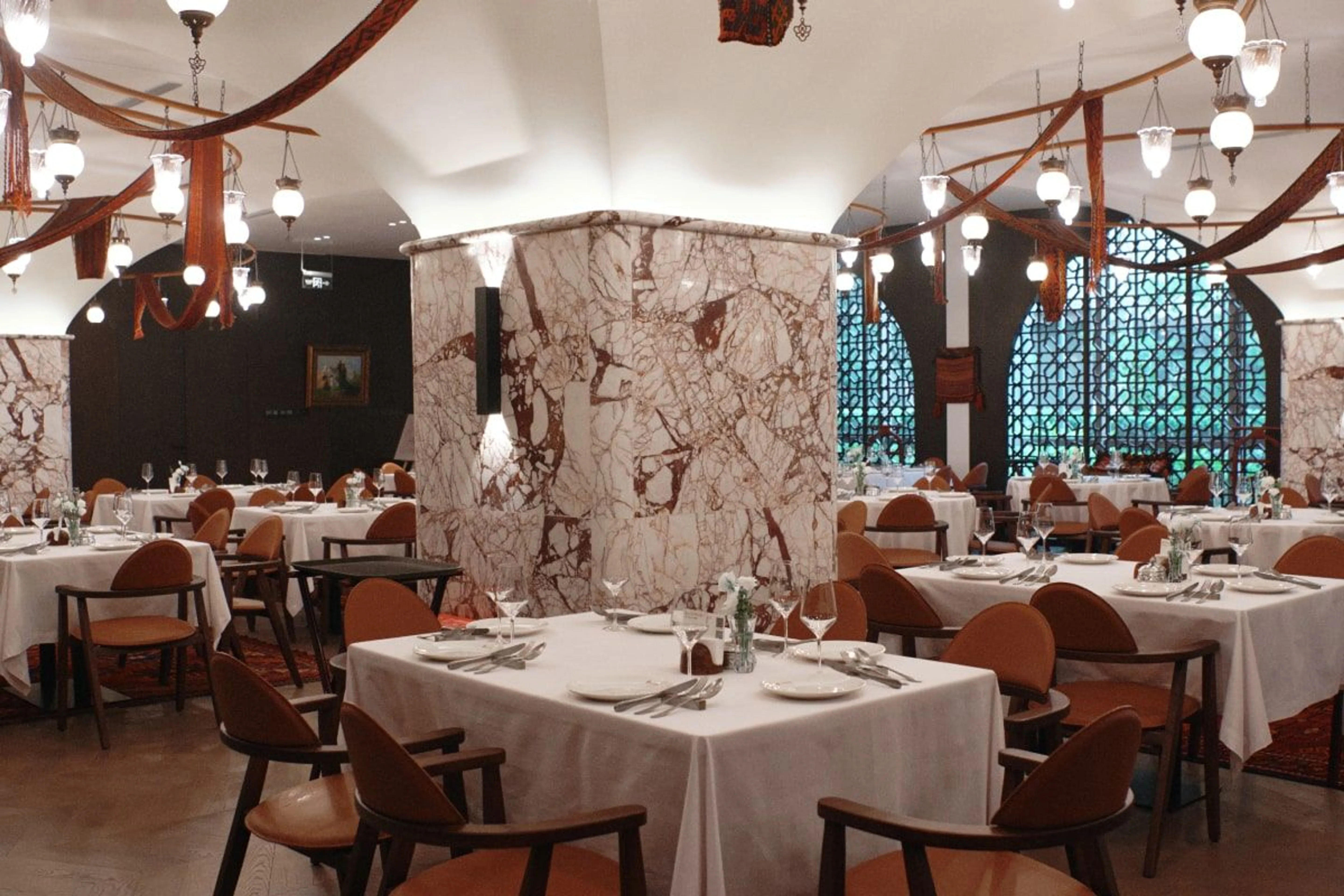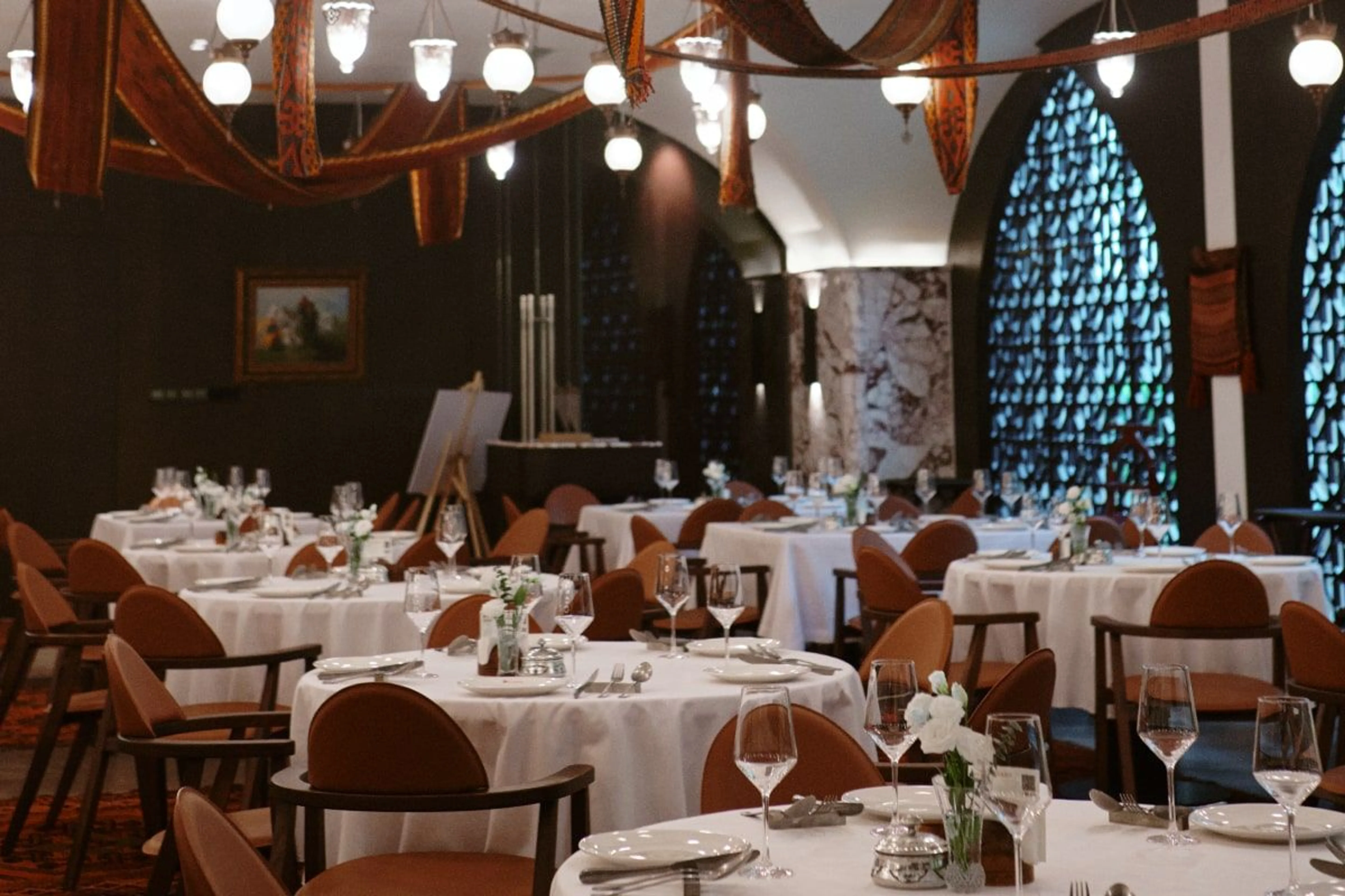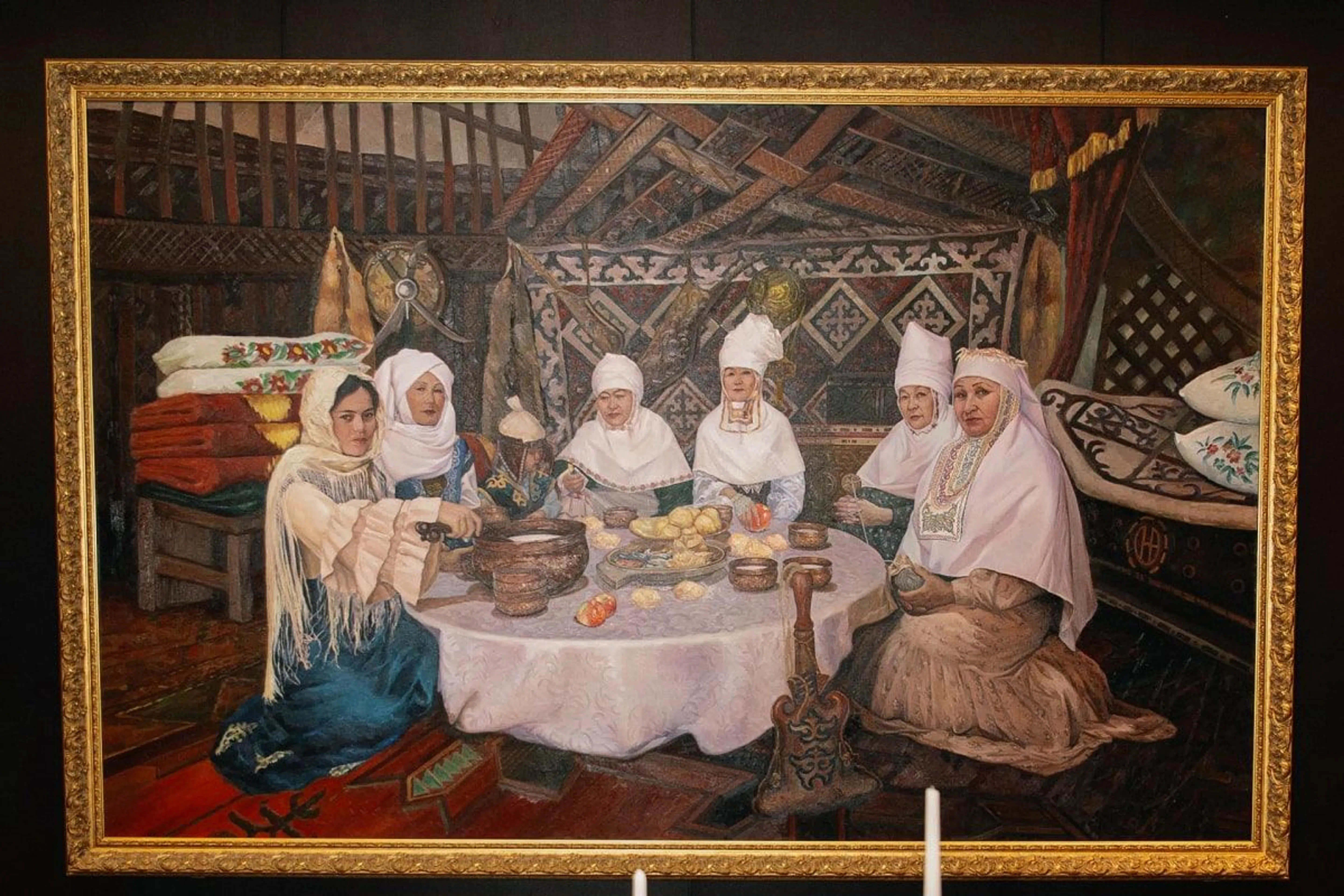 Интерьер ресторана чем-то напоминает музей: в зале выставлены “100 картин”, рассказывающих об истории Казахстана. Дополняют их подлинные этнографические экспонаты, включая традиционные изделия и элементы национального декоративно-прикладного искусства.