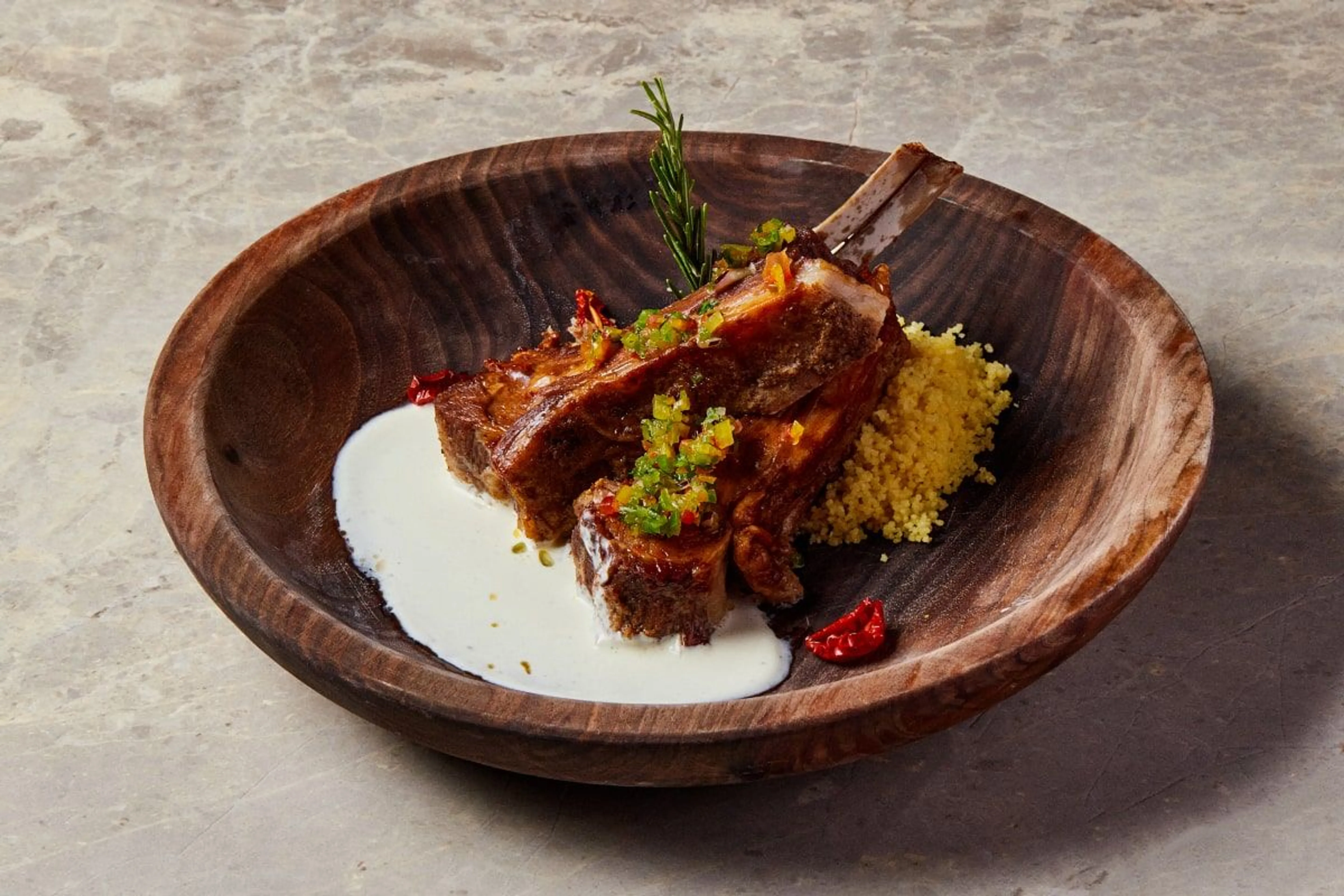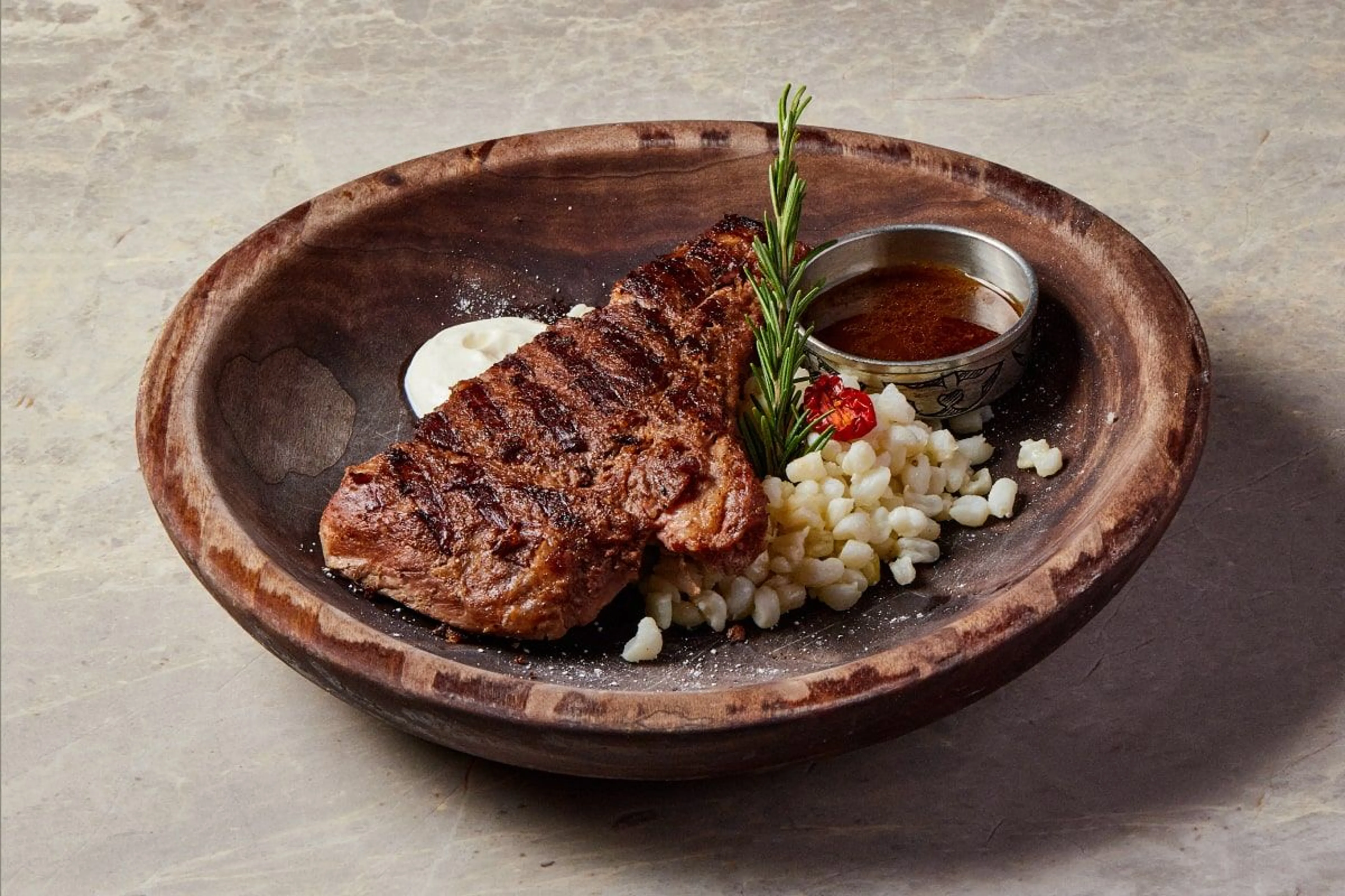 В меню все – от баурсаков и таба-нан с медом до кумыса, курта, жілік май и, конечно же, бешбармака. Даже салаты здесь с характером: Kostura с копченой кониной, баклажаны в соусе из курта, сезонные овощи с домашним айраном. Соусы тоже не простые – от кисломолочного “кефирного” до заправки из трав степи.