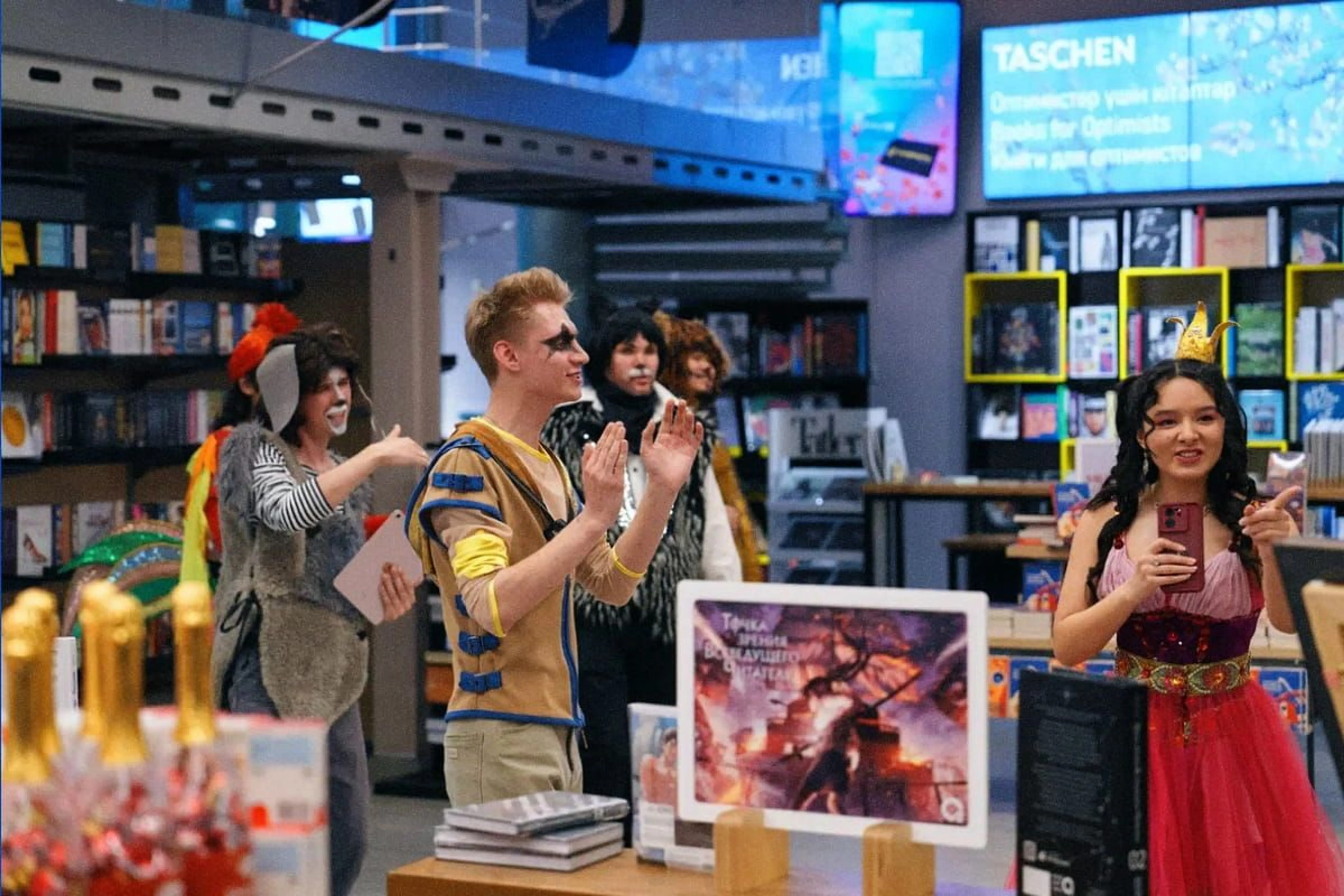 Персонажи из «Бременских музыкантов» ожили прямо в книжном магазине. Посетители стали свидетелями, как внезапно все пространство вдруг превратилось в театральное представление.