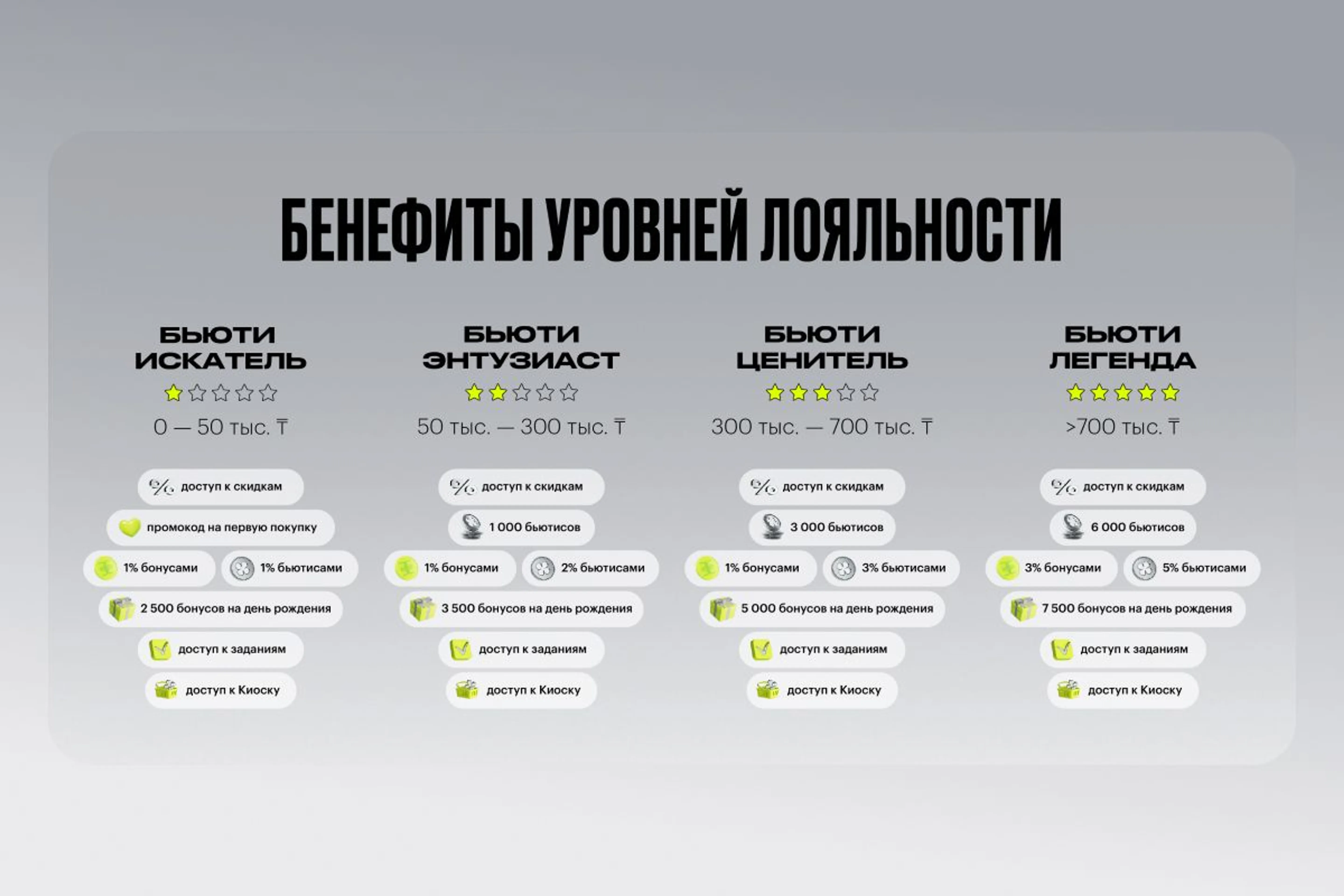 Бьюти-ценителями становятся клиенты, за год купившие больше чем на ₸300 000, этому уровню соответствует начисление 1% бонусами от покупки и 3% бьютисами.