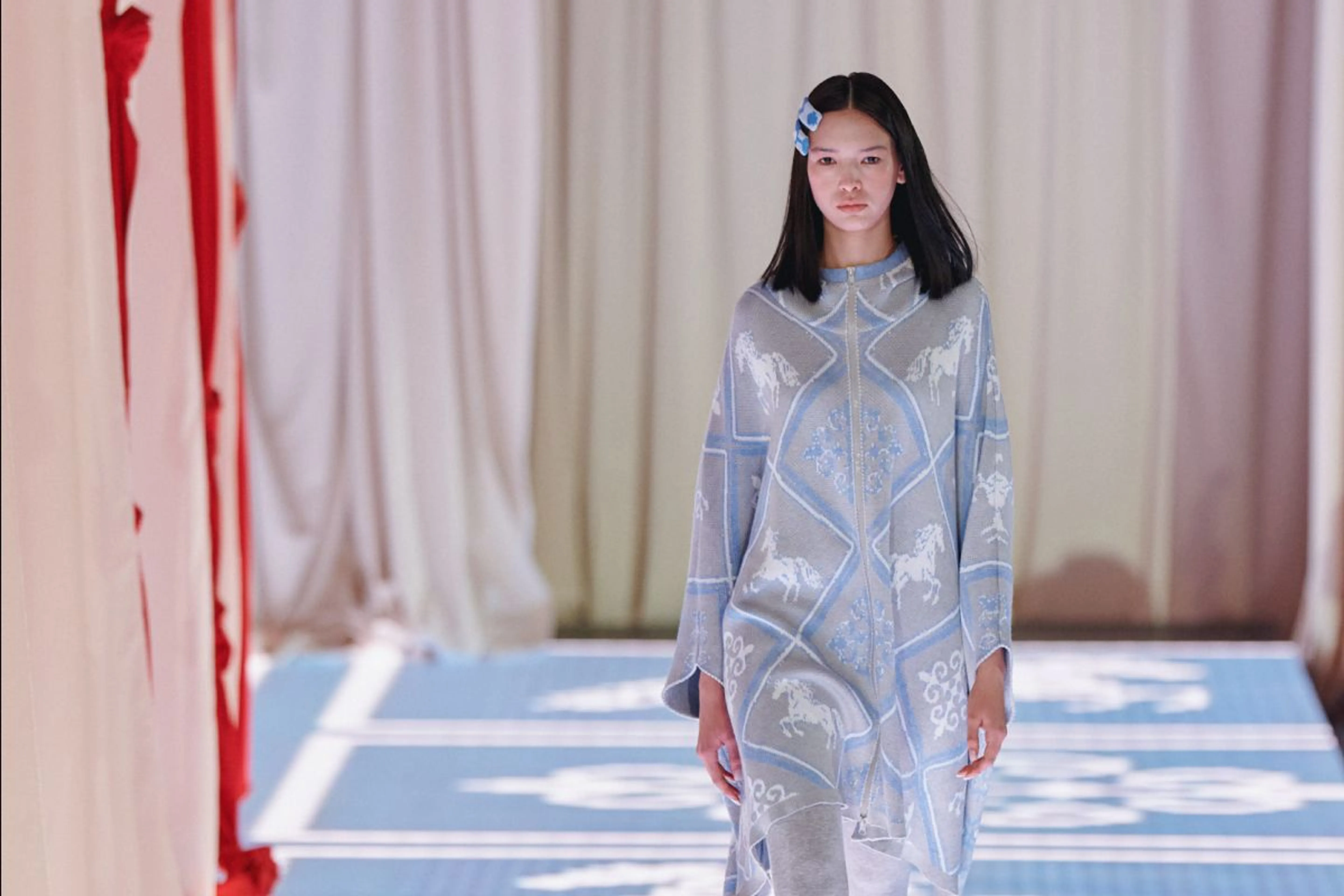 KFW Astana открыли в Национальном музее. Зал “Галерея” стал декорацией для показа бренда Dinara Satzhan, и это соседство с экспонатами выглядело логичным. Динара Сатжан пытается работать с переосмыслением визуального кода казахстанцев.