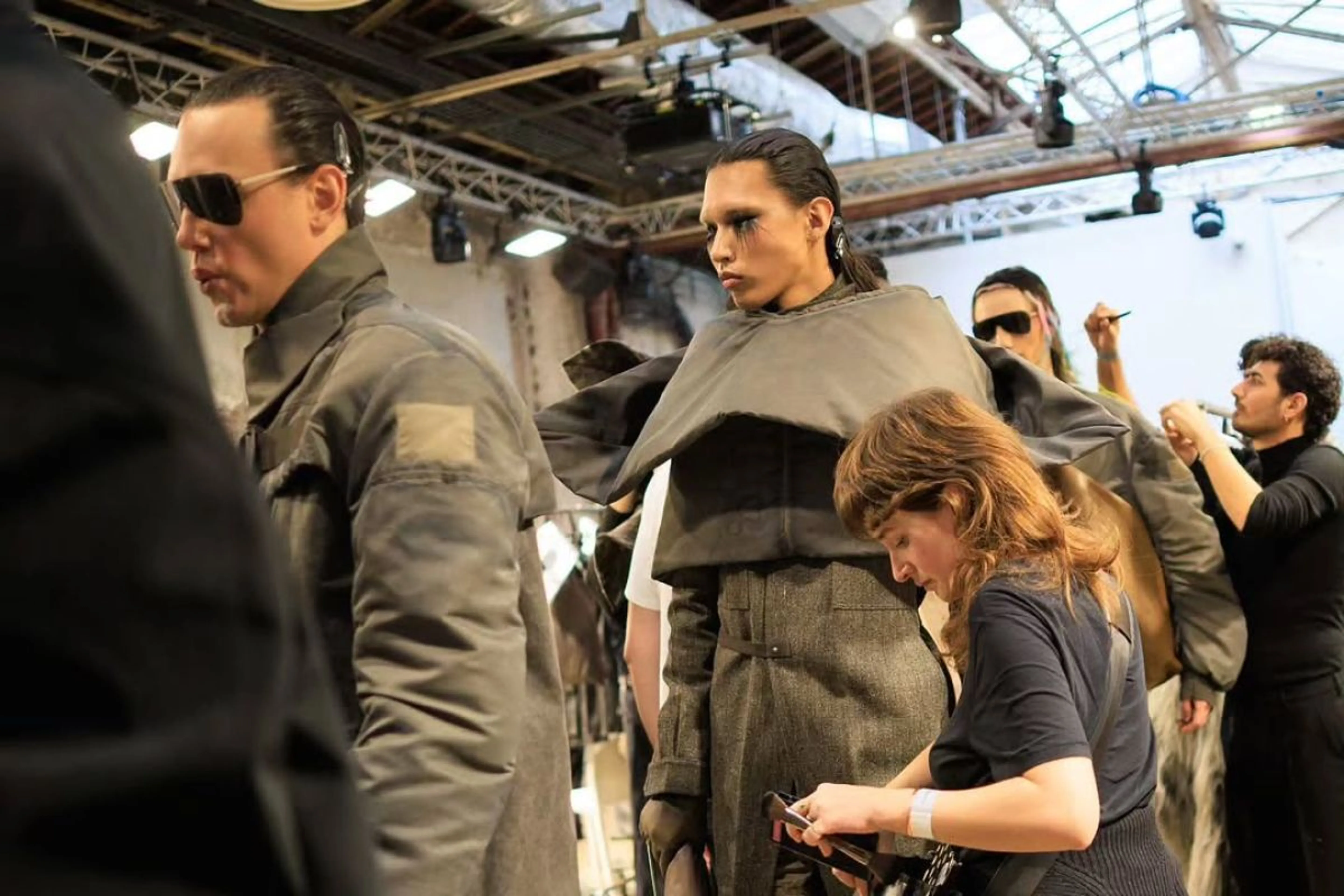 Образ многим напомнил эстетику Безумного Макса – серый костюм состоял из элементов разных текстур, отчего монохром получился занимательным. Акценты были на плечах и груди модели, а также на глазах – в первую очередь внимание притягивает грим от визажиста Даниэля Сэллстрема. Основные детали – черные линзы и длинные перьевидные нижние ресницы.
