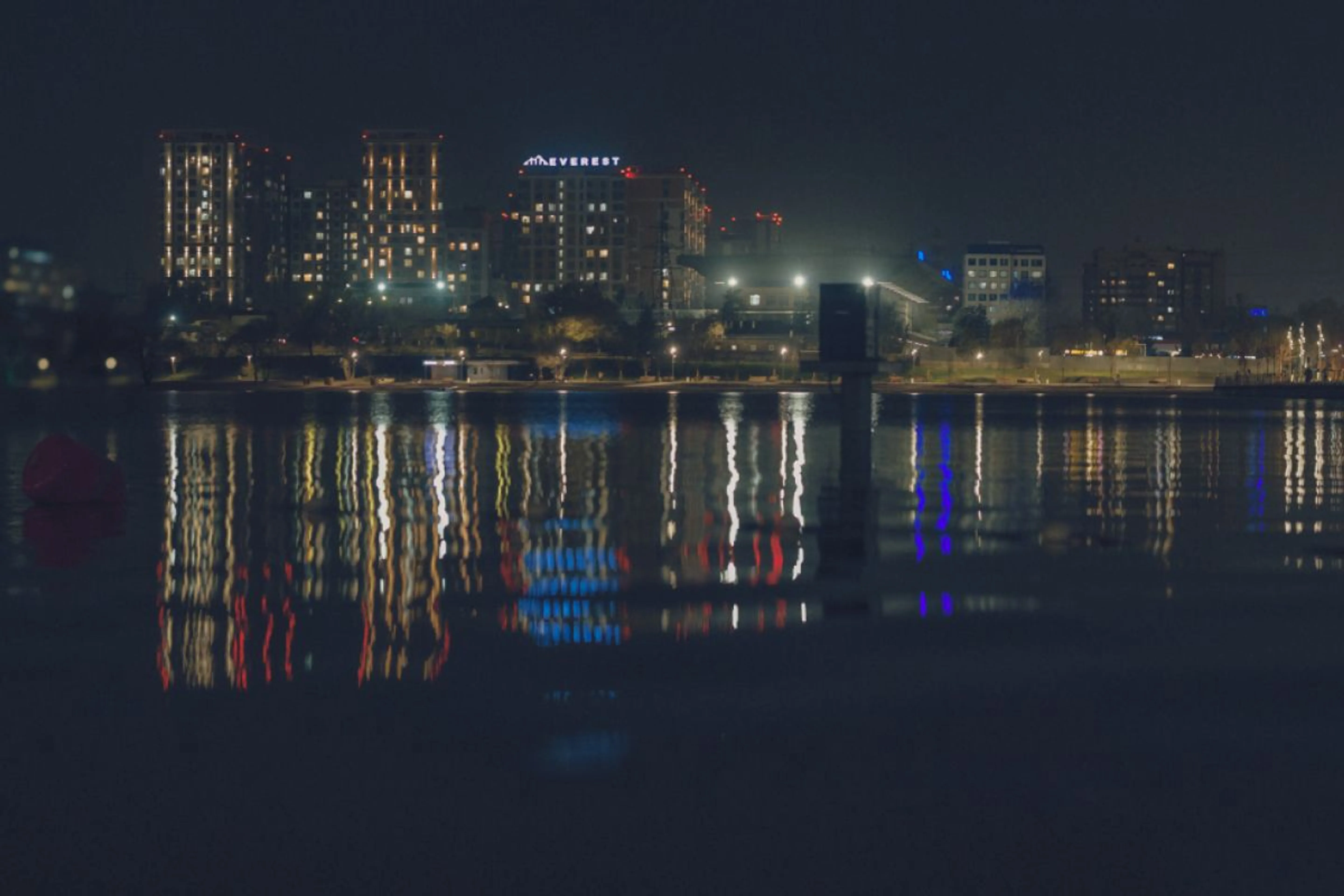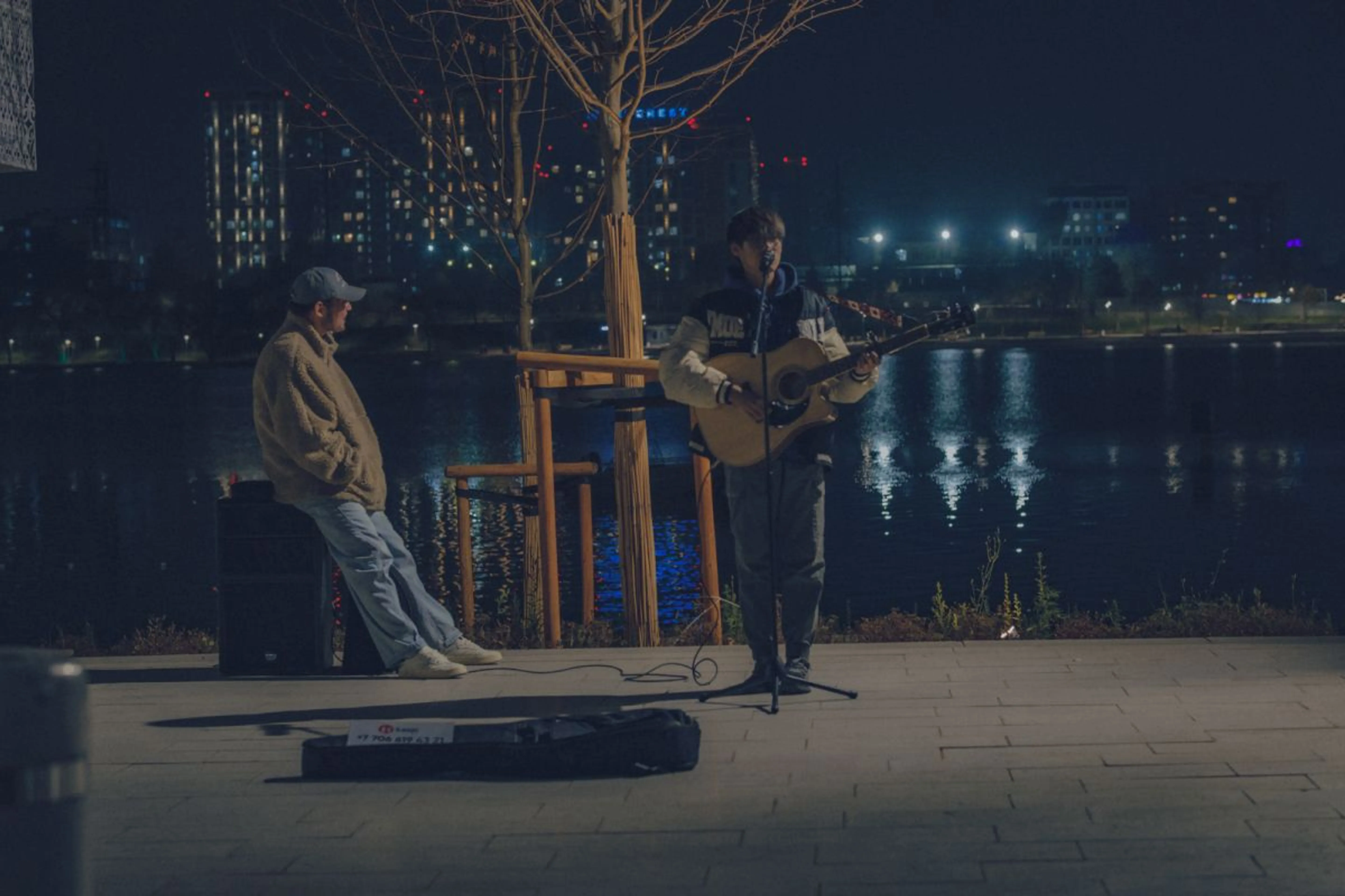 Мы дождались заката – с освещением здесь все хорошо. Гулять не страшно, отпускать детей тоже – подростки гуляют самостоятельно, катаются на самокатах. Помимо близлежащих зданий, в воде отражается подсвеченный мост. По вечерам собираются музыканты и их слушатели.
