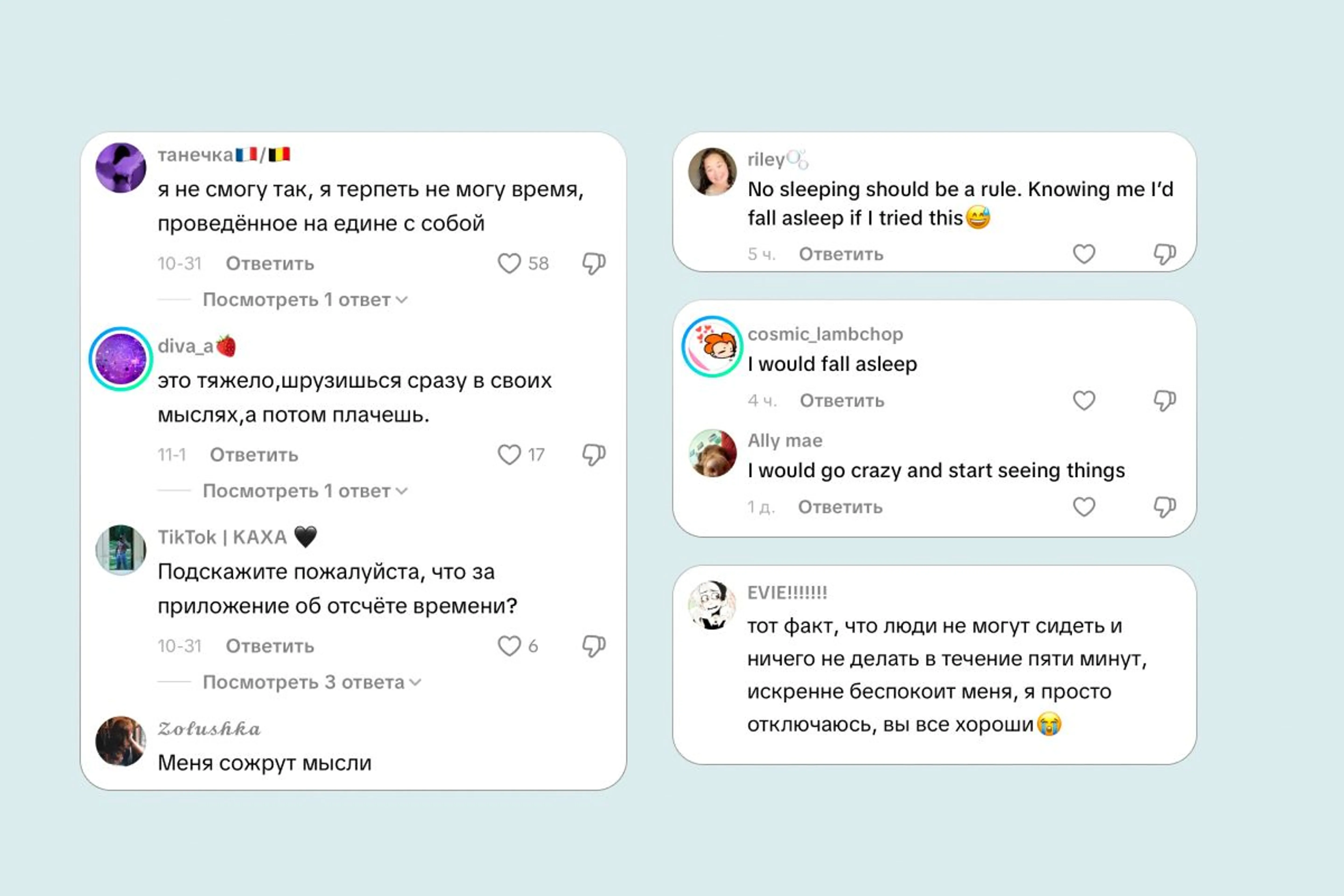 Самое сложное – начать. Комментаторы под роликами делятся опасениями: они не хотят сталкиваться с дискомфортом и заранее уверены, что эксперимент будет мучительным. Боятся тревоги, собственных мыслей, чувства одиночества и своих слез.