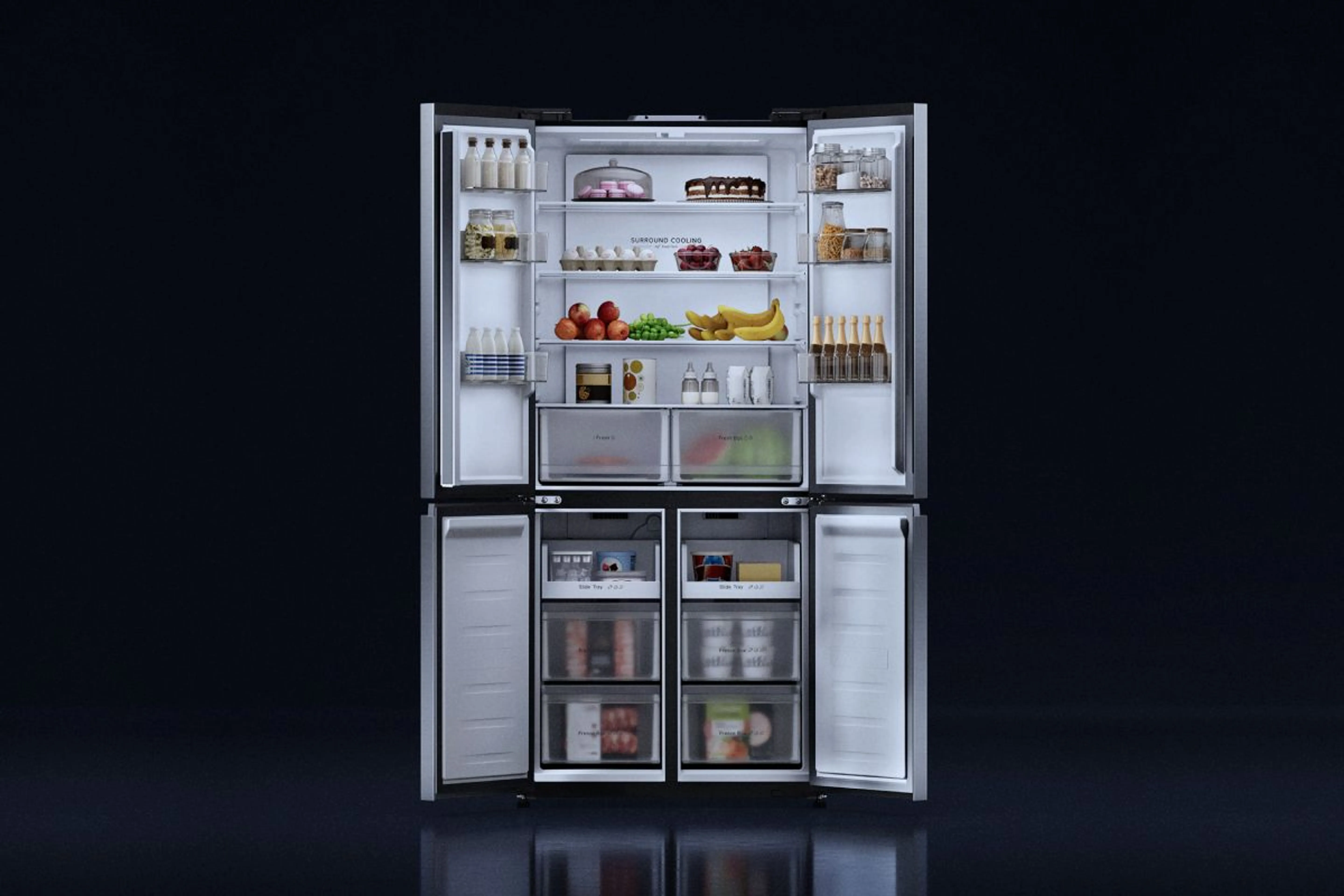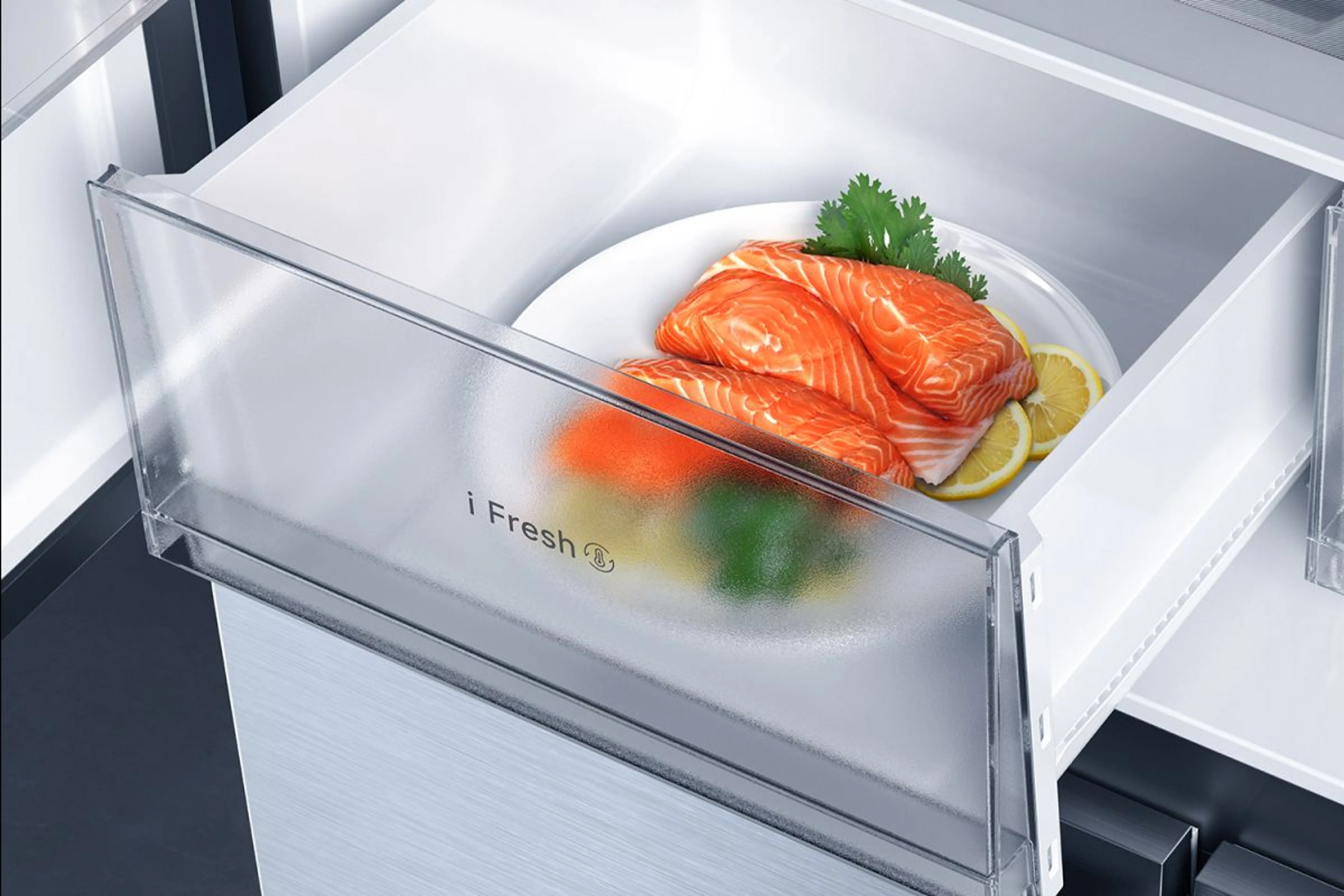 Формат Cross Door – это четыре двери и четкое разделение зон, благодаря чему пользоваться холодильником становится банально удобнее. Не нужно каждый раз "копаться" внутри. Все разложено абсолютно логично: около 293 литров под холодильное отделение и 138 литров под морозильник. Плюс дополнительная трансформируемая зона i Fresh, которую можно настраивать в диапазоне примерно от -1 до +5 градусов.